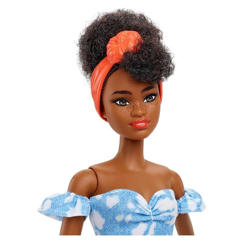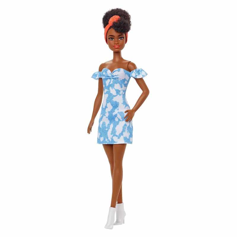 Muñeca Barbie Fashionista afroamericana con vestido azul y blanco HBV17