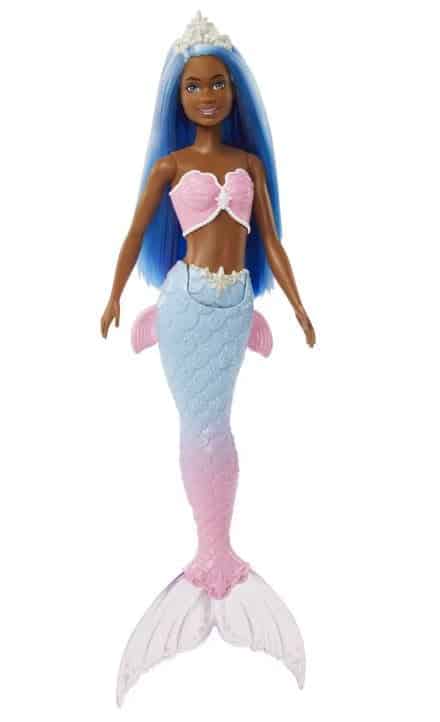 Muñeca Barbie sirena de color azul con corona de la marca Mattel