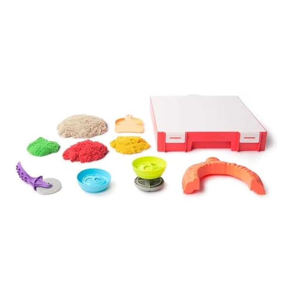 El Kinetic Sand Squish Pizza 6072551 incluye arena cinética con textura suave, moldeadores de bordes con temática de pizza (corteza, pepperoni, vegetales), espátula plástica y bandeja circular que recrea la base de una pizza. Los niños pueden formar la masa, añadir ingredientes simulados con la arena y “cocinar” su propia pizza creativa. El set añade elementos como rodillos o moldes que facilitan recrear forma, grosor y cortes realistas en la masa. La arena se adhiere a sí misma sin resecarse, ofreciendo una experiencia limpia y continua.