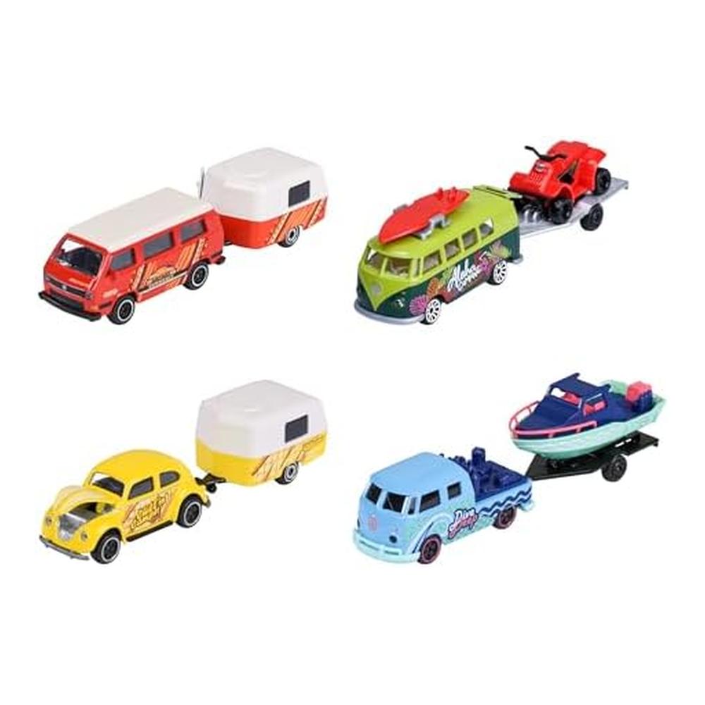 El Volkswagen Trailer Surt 4 8504102000 forma parte de una serie compuesta por cuatro modelos diferentes, cada uno con su propio estilo y accesorios. Dentro del surtido se pueden encontrar combinaciones como un Volkswagen Beetle con caravana Eriba Puck, un Volkswagen T1 con remolque y barco, un Volkswagen T1 con semirremolque y buggy, o un Volkswagen T3 con caravana. Cada unidad se envía de manera aleatoria, ofreciendo un componente sorpresa y fomentando el coleccionismo.