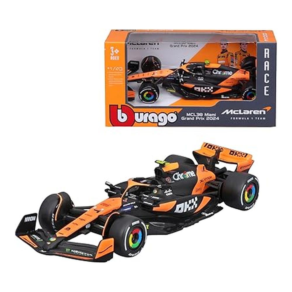 Fabricado por Bburago, marca líder en reproducciones de automóviles, este modelo garantiza calidad en sus acabados y durabilidad en sus materiales. El diseño del McLaren MCL38 se presenta con los colores emblemáticos del equipo, en los que el naranja papaya se combina con toques en negro y azul, acompañado de la decoración oficial de patrocinadores. Cada detalle, desde la aerodinámica de los alerones hasta la forma de las llantas, ha sido cuidadosamente recreado para ofrecer una miniatura que transmite toda la esencia del coche real.