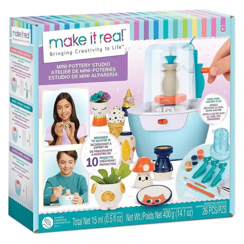 El Estudio de mini alfarería Make It Real incluye 26 piezas cuidadosamente seleccionadas para ofrecer una experiencia completa desde el primer uso. El set está pensado para que los niños puedan crear sus propias piezas de cerámica en formato reducido, simulando el proceso real de la alfarería de manera sencilla y accesible. Esta actividad no solo resulta entretenida, sino que también introduce conceptos básicos de arte, diseño y creación manual.