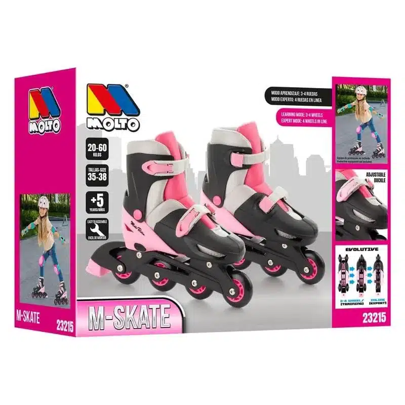 Haz tu pedido hoy del producto Patines en línea de cuatro ruedas rosa ajustables 23215 MOLTO con una edad recomendada de Más de 5 años y unas dimensiones de 38x31x11. Siendo su referencia de proveedor 23215 MOLTO, y un código de barras 8410963232158
