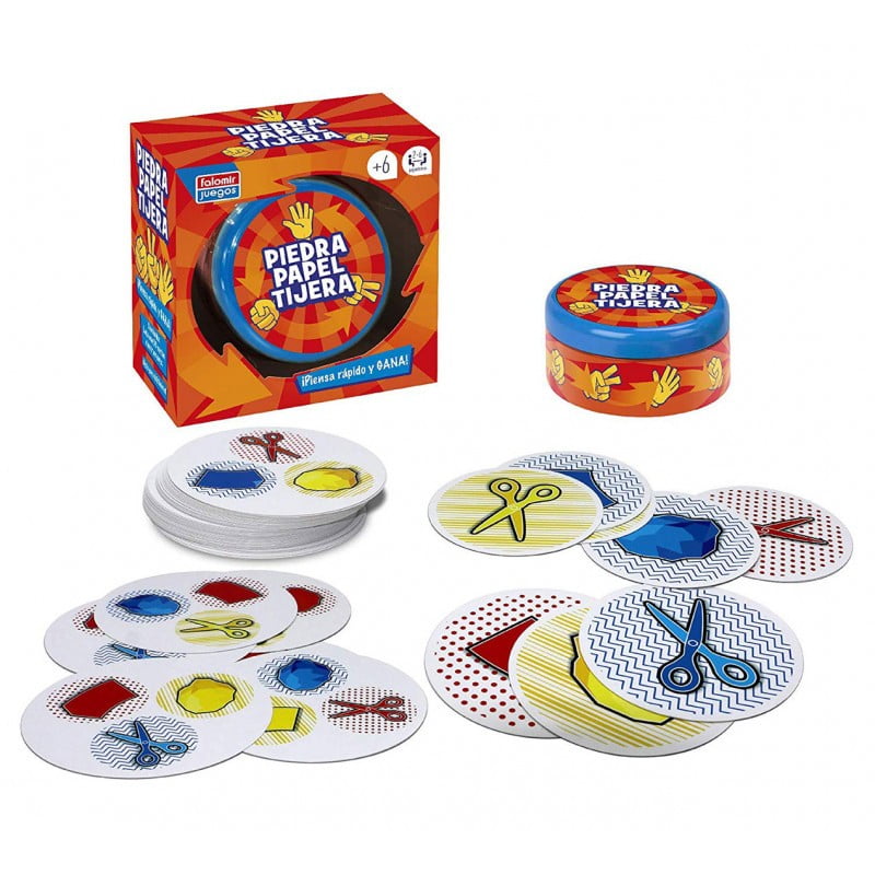 El juego piedra, papel o tijera es un juego de accion rapida de la marca Falomir, en el que tendras que sacar una carta que derrote al contrario y asi hasta acabar con todas. Contenido: 1 lata, 56 cartas y las instrucciones. De 2 a 4 jugadores. Edad recomendada: +6 años.