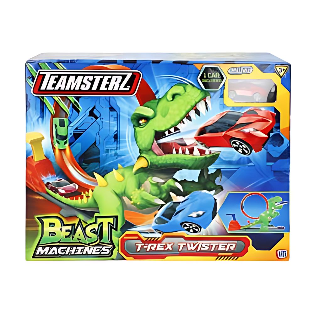 Incluye: Pista completa, figura de T-Rex y 1 coche Teamsterz metálico