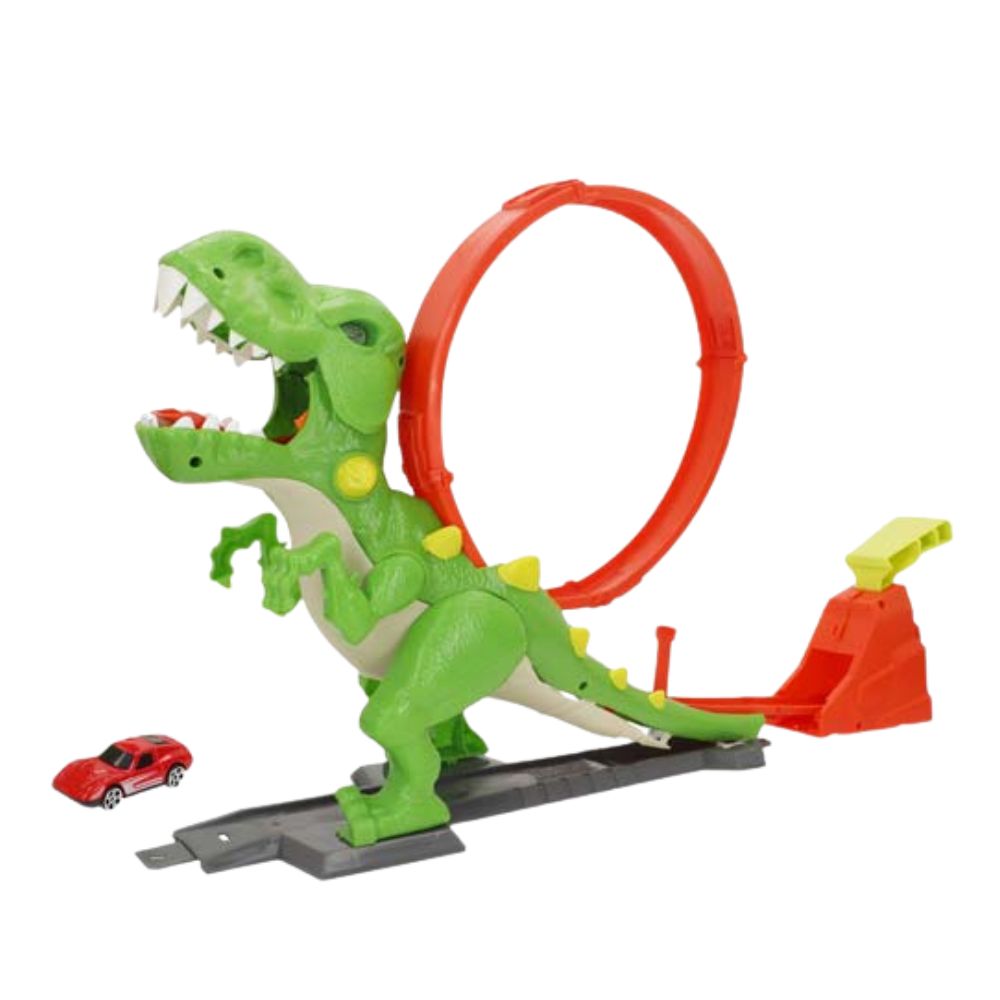 Pista temática de dinosaurios con una figura de T-Rex central.