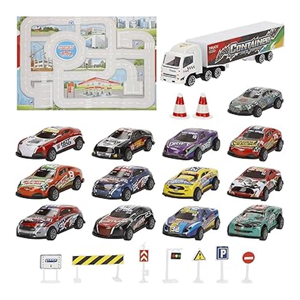Incluye dos coches en miniatura escala 1:87, con detalles realistas y colores brillantes, listos para competir.