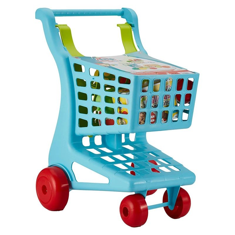 Carrito de la compra de juguete color verde y celeste con accesorios de comida surtido