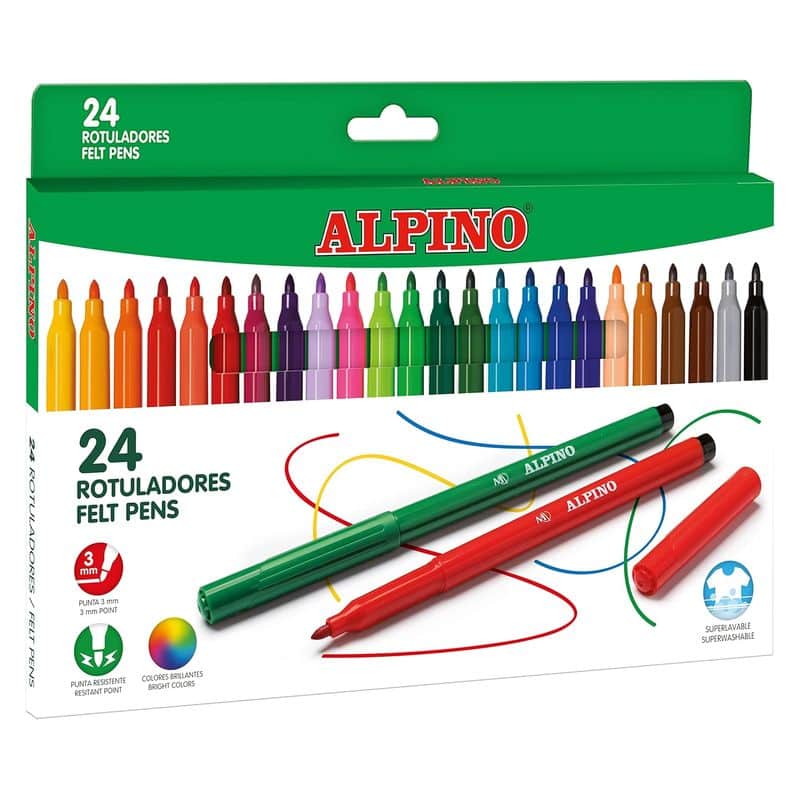 Haz tu pedido hoy del producto Alpino set de 24 Rotuladores de colores lavables con punta resistente AR001003N con una edad recomendada de A partir de 3 años y unas dimensiones de 1x1x1. Siendo su referencia de proveedor AR001003N ALPINO, y un código de barras 8413240609261