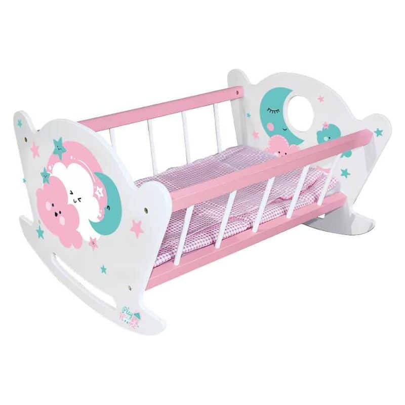 Cuna de madera de color blanco y rosa para muñecas con dibujos