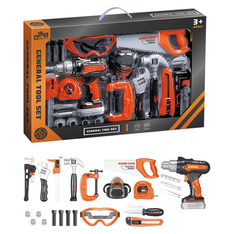 El set incluye una selección de herramientas perfectamente adaptadas a manos infantiles, entre las que destacan martillo, llaves, tuercas, tornillos, piezas de construcción y, por supuesto, un destornillador eléctrico funcional de juguete. Este destornillador, seguro y diseñado especialmente para niños, cuenta con movimiento giratorio simulado que permite atornillar y desatornillar con un solo botón, aportando una experiencia auténtica sin riesgos. Su diseño ligero, ergonómico y resistente garantiza un uso cómodo y completamente seguro.