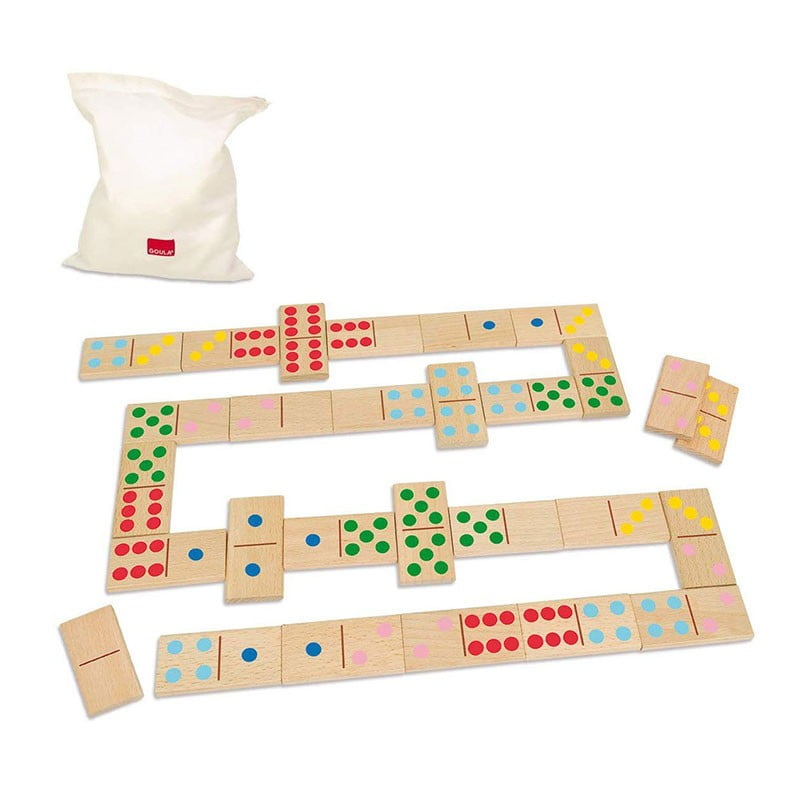 Domino de madera con colores de bonito diseño que ayuda a iniciarse en los numeros del 1 al 16. Esta compuesto por 28 piezas de madera de haya e incorpora una bolsa para guardarlas. Edad recomendada: +2 años. Dimensiones: 7 x 0,5 x 3,5 cm