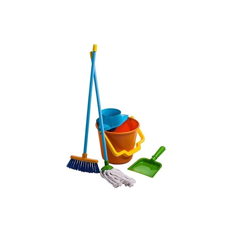 Completo kit de limpieza para imitar a los mayores en la limpieza del hogar. Un set de limpieza que incluye 1 fregona, 1 cubo, 1 pala y 1 escoba. La medida aproximada de la fregona y la escoba es de 58 cm. Un juego simbólico que fomenta la imaginación en los pequeños, pareciéndose a los mayores. Edad recomendada a partir de los 3 años
