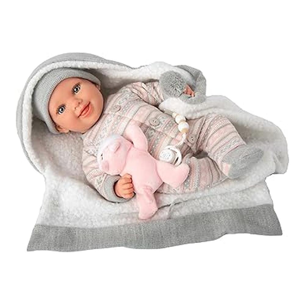 Este modelo incluye una manta rosa que aporta un toque adicional de ternura y completa la experiencia de cuidado. Gracias a este accesorio, los niños pueden arroparla y recrear rutinas cotidianas de atención y cariño, lo que favorece el juego simbólico y estimula la empatía.