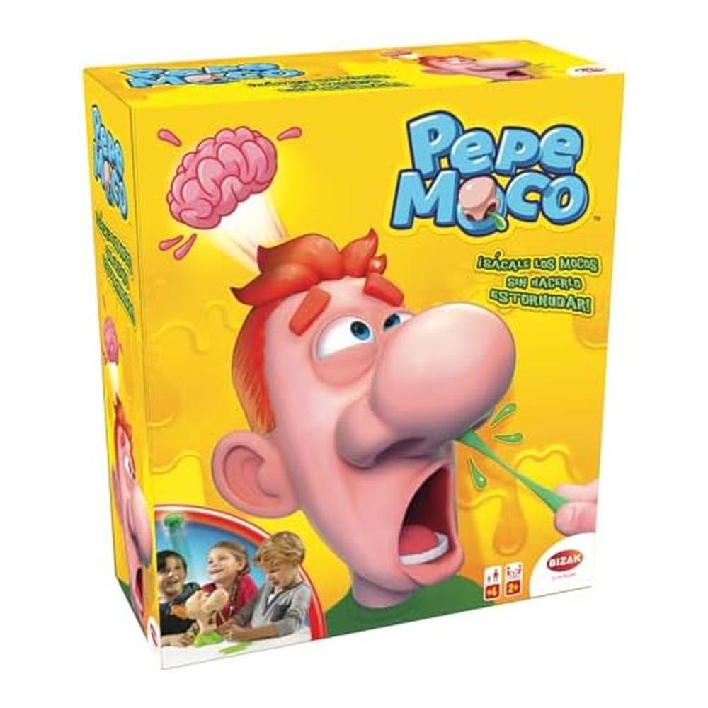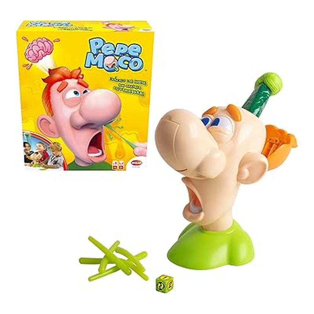 Pepe Moco es un juego de habilidad y tensión familiar donde el objetivo es retirar los mocos del personaje sin provocarle un estornudo. El desafío está en la maniobra precisa: extraer el número exacto de piezas indicadas por el dado, sin activar el mecanismo que hace “estornudar” al muñeco, ¡y ver cómo sale volando su cerebro de fantasía!