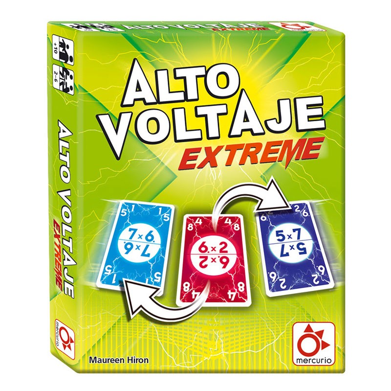 Alto Voltaje Extreme es un juego en el que los jugadores tendran que quitarse sus cartas antes que los demas. Para ello, al igual que ocurre en la version estandar del juego, deberan colocar las cartas correspondientes a la operacion matematica resultante. En este caso deberan añadir la carta correspondiente al resultado de la multiplicacion que se origina en la carta del centro de la mesa. En caso de que el resultado sea una cifra de dos numeros podran añadir una carta en cuyo extremo se encuentre uno de los dos numeros que conforman ese resultado de dos cifras, es decir, si el resultado es 12, podran poner una carta que contenga el numero 1 o el 2. Los jugadores podran poner de forma simultanea varias cartas siempre que el resultado sea correcto. Ganara la partida quien antes se quede sin cartas. El juego otorga la posibilidad de combinarse con la version estandar por lo que se pueden combinar sumas, restas y multiplicaciones, como si de una expansion se tratara, pero otorgando la posibilidad de jugarse por separado. El juego incluye 61 cartas y el manual con las reglas de juego. La duracion de la partida es de unos 20 minutos. Mientras que la edad recomendada es de mas de 10 años y esta pensado para un rango de jugadores de entre 2 y 6